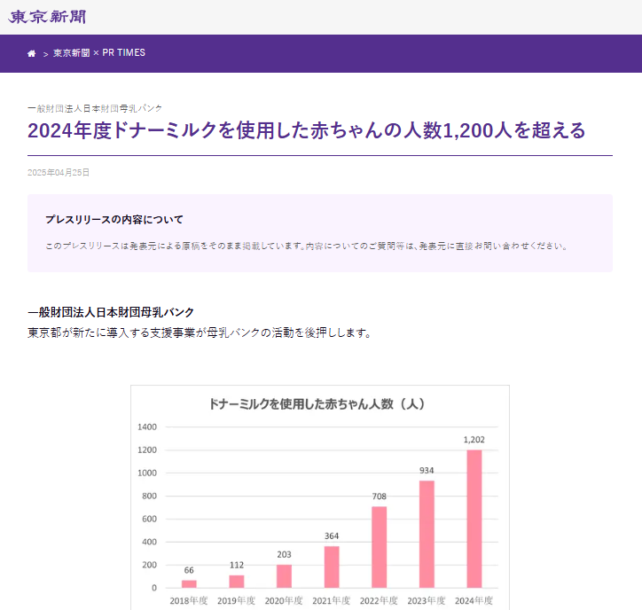 『2024年度ドナーミルクを使用した赤ちゃん人数1,200人を超える』