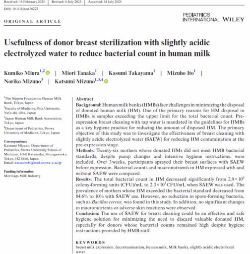 三浦研究生らの論文「Usefulness of donor breast sterilization with slightly acidic electrolyzed water to reduce bacterial count in human milk」がPediatrics Internationalに掲載されました。母乳バンクでは、ドナーミルク提供にあたって細菌検査の基準を設けており、基準を超えた母乳は廃棄されることになります。この研究では、微酸性次亜塩素酸水を使用した乳房清拭による母乳中の細菌数減少効果を検証しました。清拭後に搾乳を行った結果、細菌数が大幅に減少し、細菌検査の合格率が増加することが確認されました。また、母乳成分の変化も起こりませんでした。人体への安全性が認められている微酸性次亜塩素酸水の活用は、貴重な母乳の有効活用に貢献する新たな対策として期待されます。