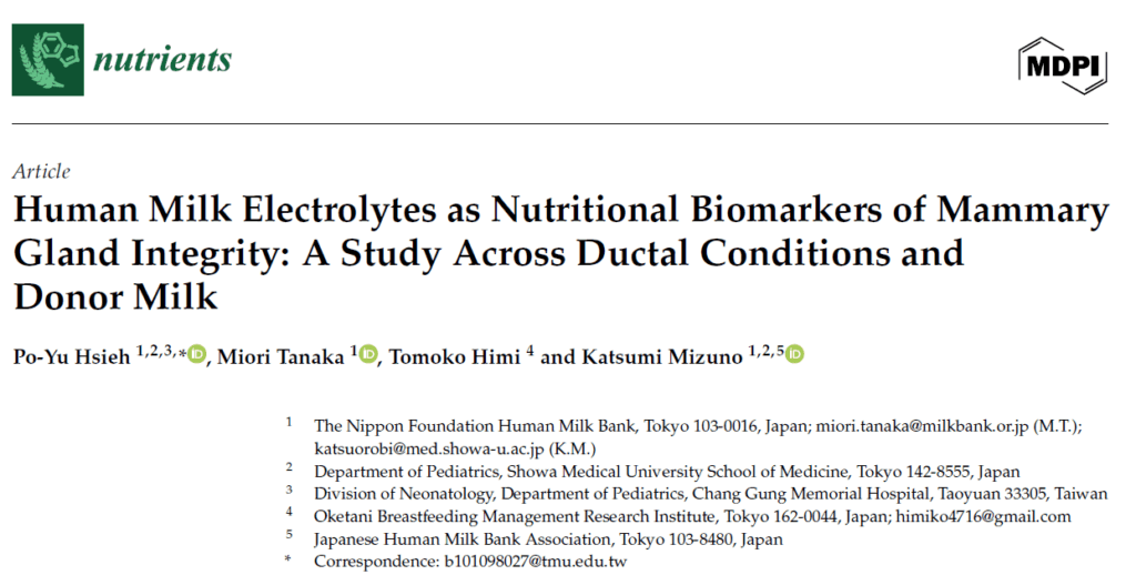 謝研究生らの論文「Human milk electrolytes as nutritional biomarkers of mammary gland integrity: a study across ductal conditions and donor milk」がNutrientsに掲載されました。本研究では、詰まり乳腺・混合乳腺・正常乳腺の母乳とドナーミルクにおけるナトリウム(Na)及びカリウム(K)濃度を測定し、乳腺の健康状態を反映する指標としての有用性を検討しました。その結果、乳腺閉塞のある母乳ではNa濃度及びNa/K比が有意に高く、Na濃度は特に優れた識別性能を示しました(AUC = 0.96)。ドナーミルクは電解質濃度が最も低く安定していました。本研究は、母乳中のNa濃度が非侵襲的に乳腺の健康状態を評価する優れたバイオマーカーとなる可能性を示唆しています。